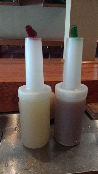 You can't beat the Store 'N Pour brand containers to make a bartender's life easier. The different colored spouts and lids make it easy to identify the liquid it holds so filling and replacing juices is fast and efficient- the color code eliminates the guessing. This design also eliminates any leaking or messy drips unlike some other brands.