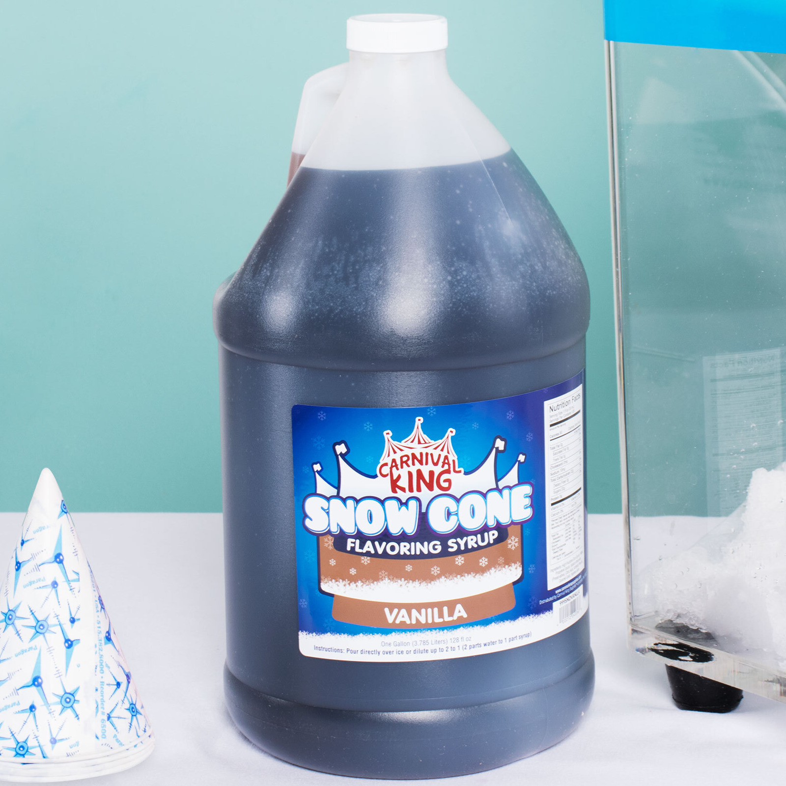 Colorful and flavorful snow cones are sure to draw customers to your concession stand or carnival cart. Keep up with the demand for these refreshing frozen treats with this Carnival King 1 gallon vanilla snow cone syrup! With the large amount of servings per container, your venue will be in good supply.