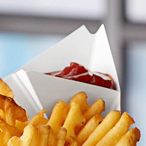 This fry cone features a convenient fold-out pocket for condiments and sauces that makes it easy to serve chicken fingers, fries, onion rings, or waffles and ice cream with the perfect condiment. Fill the pocket with ketchup, honey mustard, barbecue sauce, or even whipped cream! Plus, its pre-folded design allows for easy assembly in busy serving areas.