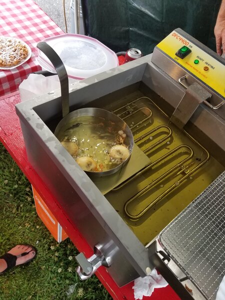 Many of my customers asked me to make funnel cakes, along with my fried pies, and this funnel cake ring works very well in my cast-iron dutch oven. I don't need the element guard, so I don't know how well this would work.