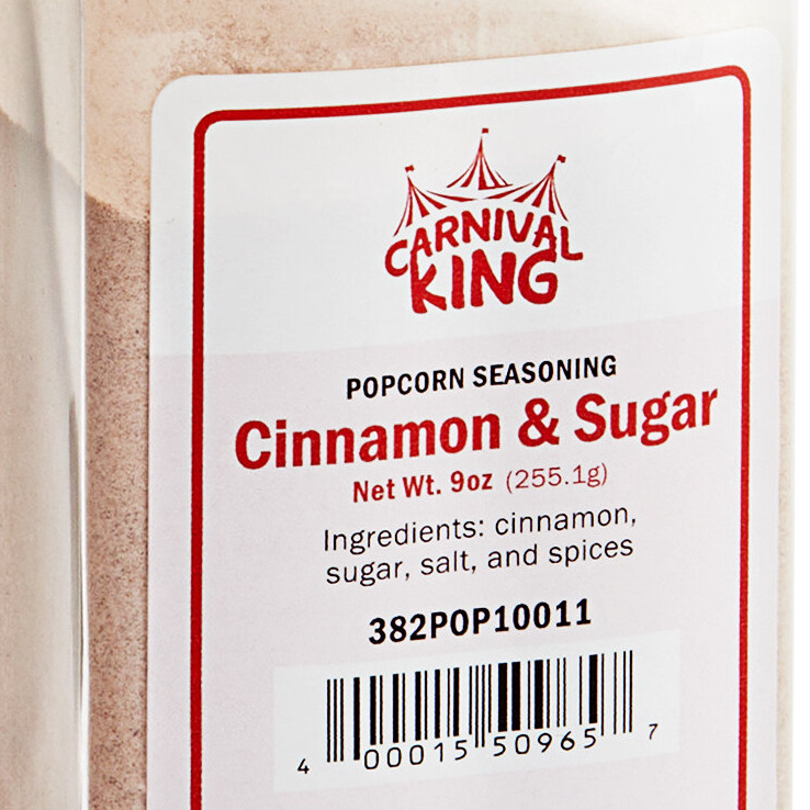 This powdered seasoning delivers a delicious blend of spiced cinnamon and sugar satisfy every craving. This product is packaged in a 9 oz. container with a convenient flip-top lid that makes it easy to cleanly measure and dispense seasoning, saving you time during prep to keep wait times low and customers happy. Suited perfectly for use in your theater's concession stand, snack bar, or cafeteria, this product elevates your average popcorn offerings and brings a new flavor profile to this popular snack.