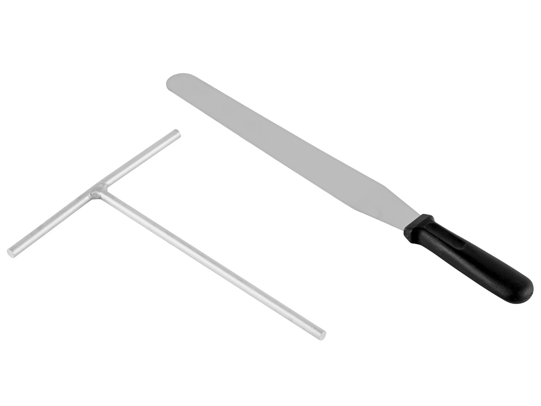 • Includes a 10 1"/2" long aluminum T-shaped metal crepe spreader and 12" spatula