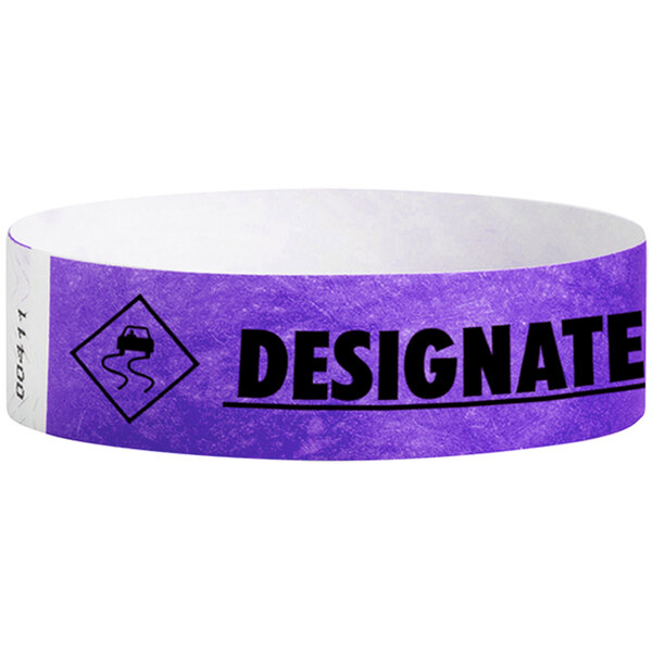 Easily identify designated drivers with this Carnival King Tyvek® 3/4" x 10" neon purple "DESIGNATED DRIVER" disposable wristband!