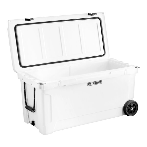 Hold ice and keep food and beverages chilled with the CaterGator White 110 qt. mobile rotomolded outdoor cooler / ice chest.