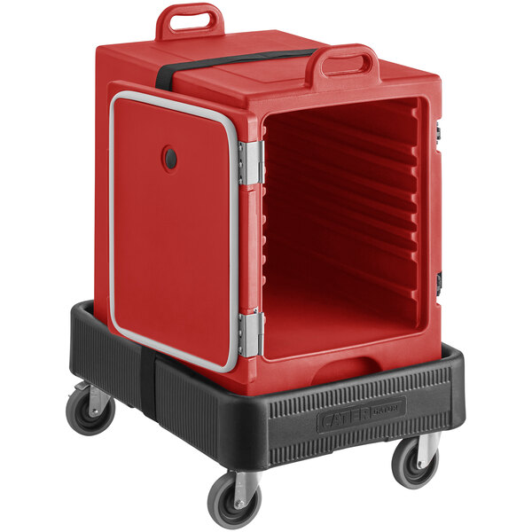 Perfect for catering events, trust this CaterGator cherry red insulated front loading 5-pan carrier with black dolly and strap to help you transport your signature dishes safely to and from events.