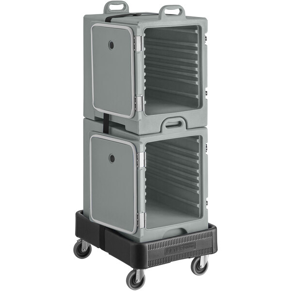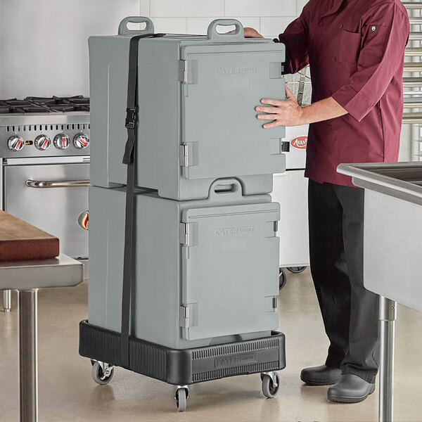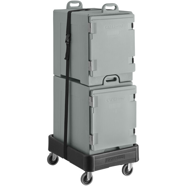 Perfect for catering events, trust this CaterGator slate blue insulated pan carrier kit with two front loading carriers, dolly, and strap to help you transport your signature dishes safely to and from events.