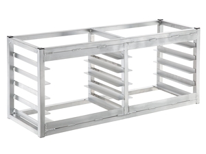 This durable rack can hold up to 10 half size sheet pans. The rack is designed so that you have 3" between each slide so you have plenty of room to pack your pans full of cupcakes, cookies, pies, and broiled foods.