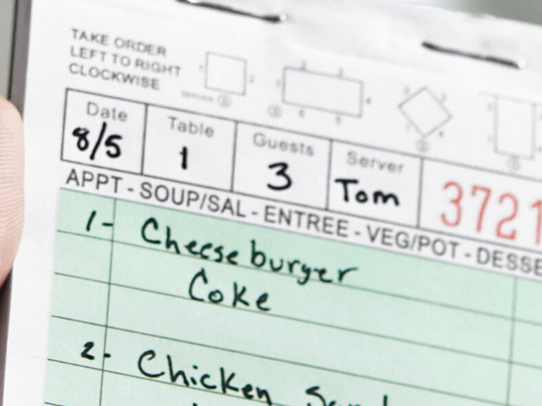 Table diagrams at the top of each order sheet enhance order accuracy. Each patron is assigned a placement at the table that corresponds with a row on the order pad.