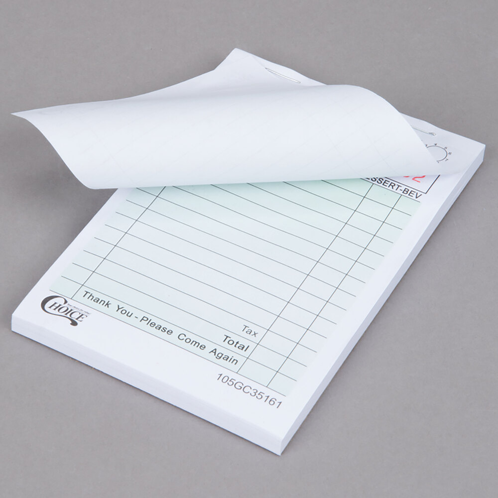 Give your staff the tools necessary for them to collect and bill orders quickly and accurately with this Choice 1 part green and white guest check! It features everything your staff needs to increase productivity and overall customer satisfaction. Plus, since each sheet is bound into a pad of 100, you’ll never have to worry about loose sheets or mixed up orders, again.