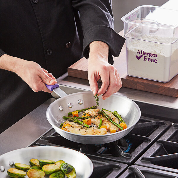 Cook delicious meals with absolute ease and skillfully brown, sear, fry, or scramble your menu items in this Choice 10" aluminum fry pan with purple allergen-free silicone handle.