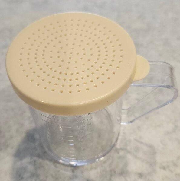 This is a very handy shaker and is useful for flour, sugar and so much more. I am including a video that shows a comparison of all the different tops you can buy for it and how they differ. The top that comes with this shaker has very fine holes that do not shake out flour very well. I recommend getting a bigger hole lid.