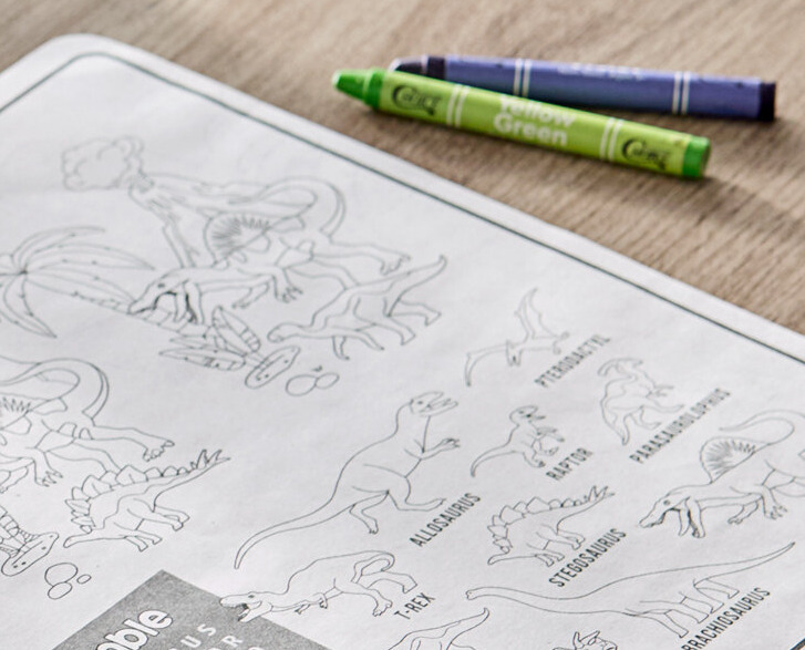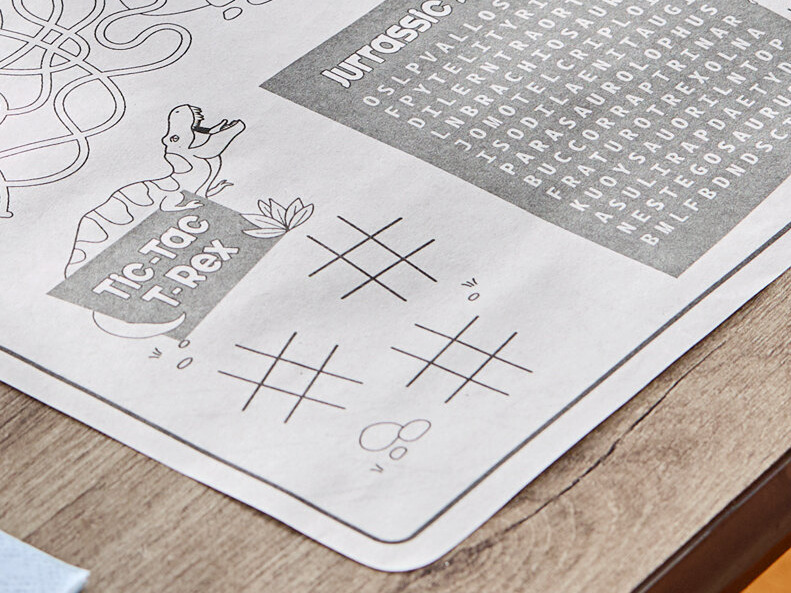 Featuring fun illustrations and visually-appealing, dinosaur designs, the placemat contains various games to keep your younger guests occupied.