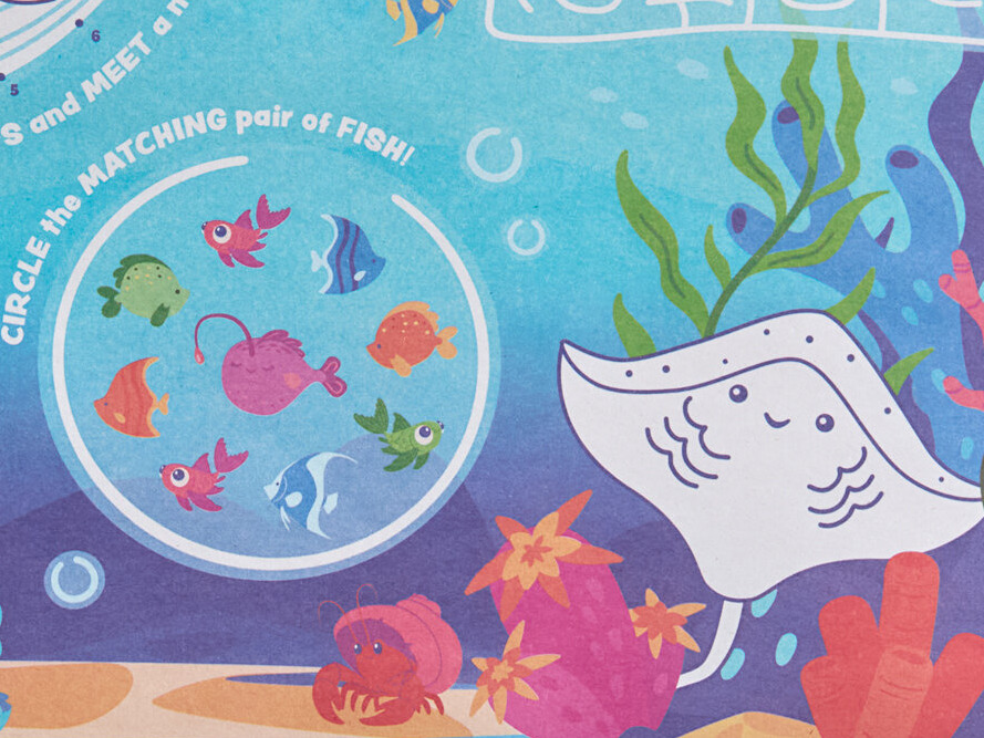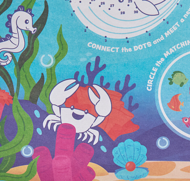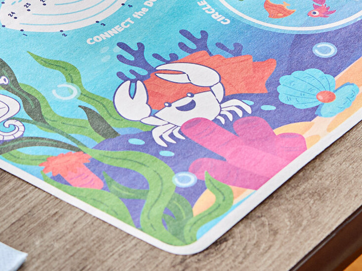 Featuring fun illustrations and visually-appealing, sea-themed designs, the placemat contains various games to keep your younger guests occupied.