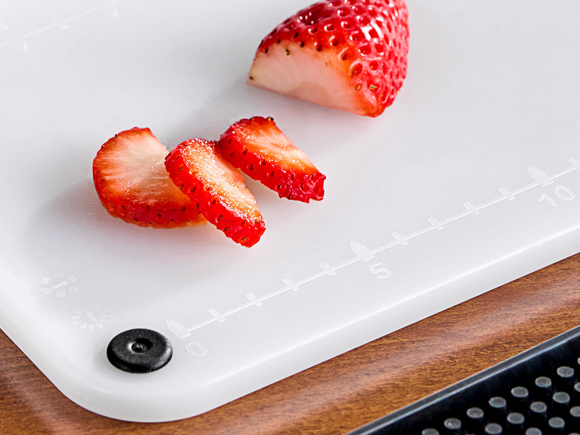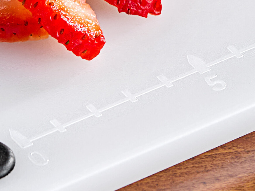 The board features a ruler on each side, allowing you to measure food in inches or centimeters for effortless portioning and consistent cuts.