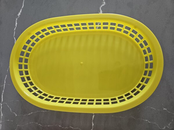 These plastic baskets are the perfect size for a burger and fries. They are super easy to clean and easily withstand the heat from hot foods.