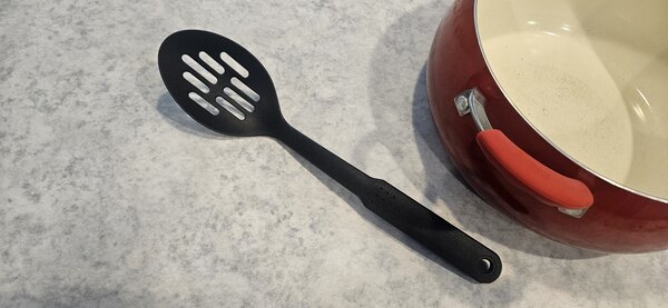 - Durable black nylon construction won't scratch non-stick pots and pans
