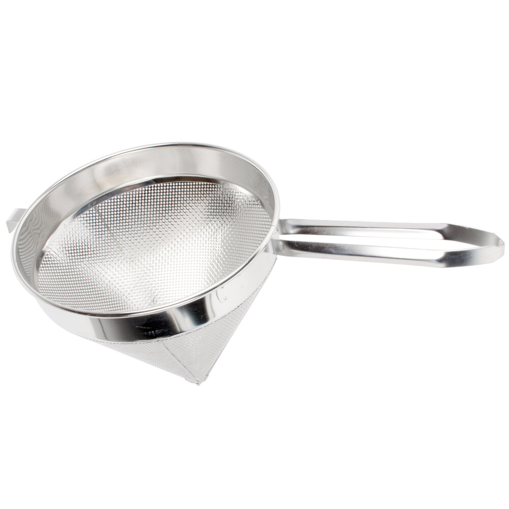 This 8” coarse China Cap strainer works well as a regular strainer, too! Though it is harder to clean than a traditional, curved-bottom strainer. The mesh is sturdy and overall construction is durable.