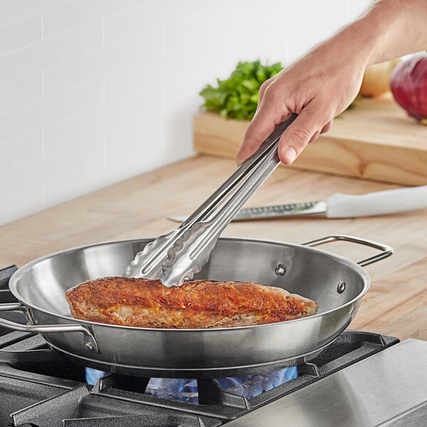 Satisfy your front- and back-of-house cooking and food-handling needs with these utility tongs! Made of 18 gauge stainless steel, these Choice 12" extra heavy-duty stainless steel utility tongs are the perfect choice for efficiently handling and serving food in a fast-paced environment. Experience incredible ease of use while serving and cooking meats, salads, and side dishes thanks to these Choice tongs. Featuring a concave utility end, these tongs include a scalloped-edge design that grips food firmly and gently. The two-piece stainless steel construction allows for quick and easy cleaning and presents a sleek, professional appearance that complements both front- and back-of-house settings.