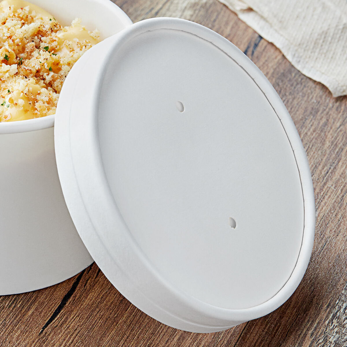 To avoid soggy product, this container and lid combo includes a vented paper lid that lets hot, moist air out, before it becomes stuck within the container. It is a crisp, white color, for a clean presentation every time, and it's made of the same double poly-coated paperboard as the container, so you know it's both durable and moisture resistant.