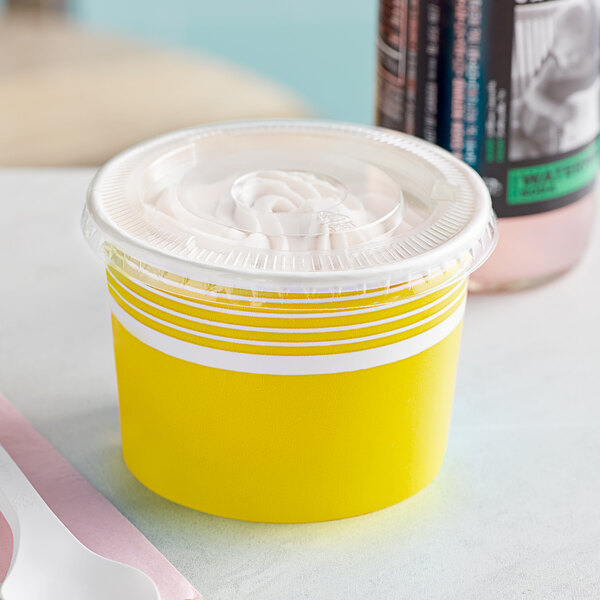 This cup's interior features a polyethylene coating for excellent leak resistance, and the cup's eye-catching, bright yellow color scheme helps add a pop of personality to your take-out offerings. The cup's 12 oz. capacity allows users to pile on tasty toppings or add an extra scoop of their favorite flavor with ease.