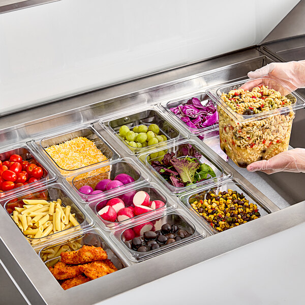This set features (9) 1/6 size pans and (3) 1/9 size pans, for a total of 12 pans, perfect for refilling your Avantco 27" cutting top sandwich prep table. With a 6" depth, a 1.25 qt. capacity in the 1/9 size pans, and a 2.5 qt. capacity in the 1/6 size pans, this set is a versatile addition to your kitchen. Use it to prep, store, transport, and serve food items.