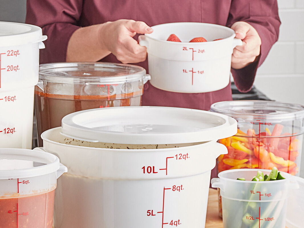 Bold red graduations are printed on the side of the container in both quarts and liters for easy, immediate measuring, saving you time and effort during food preparation. Easily identify and track the date that your food product was made using the reusable "date" indicator at the bottom of the container, or simply adhere a label (sold separately) to the side.