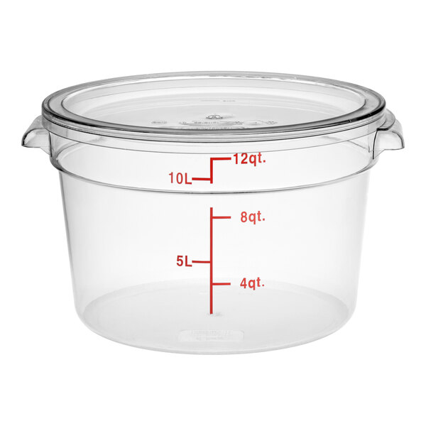 Whether storing dry goods or prepped ingredients, this container is versatile and can handle temperatures ranging from -40 to 210 degrees Fahrenheit, making it ideal for a wide range of kitchen tasks. This Choice clear round polycarbonate food storage container with lid is perfect for restaurants, catering establishments, delis, and cafes that want to enhance their service and streamline their prep organization!