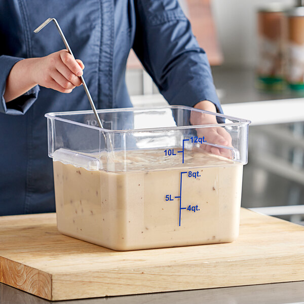 This food storage container is perfect for restaurants, caterers, delis, and cafes. The textured bottom provides durability against scratches and doubles as a non-skid surface, meaning your container won't easily slide around. When paired with a compatible lid (sold separately), it keeps food fresher for longer than when covered with traditional foil or plastic wrap. Use this 12 qt. container to store any ingredient or prepped food in your commercial kitchen.