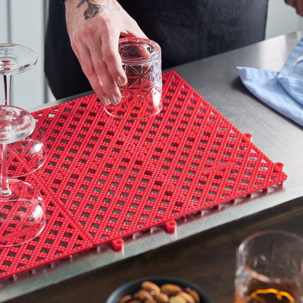 Perfect for lining shelves and counters, this Choice 12'' x 12'' red interlocking bar mat is a great addition to your bar, cafe, restaurant, or pub!