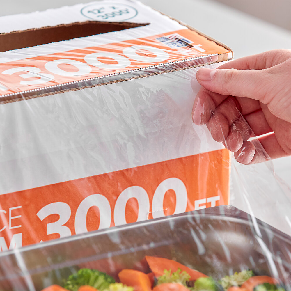 The 12" width is great for covering small and medium containers or bulky food items. With 3,000' of film wrap in every roll you can be sure that your business is in good supply!