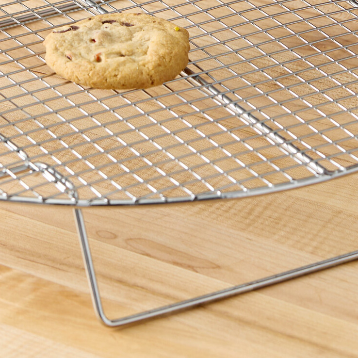 The Choice 10 1/2" Round Footed Chrome Plated Steel Cooling Rack is a great addition to my baking tools. Its sturdy construction and elevated design allow for efficient cooling of baked goods, ensuring they retain their shape and texture. I'm satisfied with this cooling rack, and it has been a valuable asset in my kitchen.
