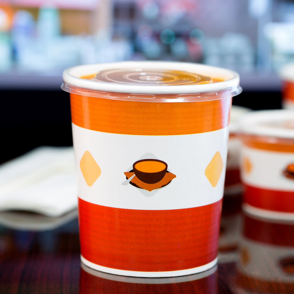 Engage your customers by offering to-go soups, stews, chilis, and more in this paper hot food cup. Featuring colorful imagery, this container serves as an advertisement for hungry guests passing through your convenience store, cafe, or grocery store. While the bright, colorful graphics are sure to draw attention, the clear plastic lid lets the contents of the cup show through, adding even more visual appeal.