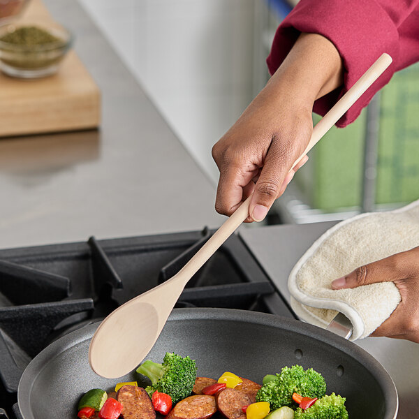The broad and oval concave bowl simplifies mixing, stirring, and tossing ingredients during food preparation, while the smooth edges and sanded surface ensure a quality product for your kitchen's use. Try the Choice 16" wooden spoon to add elegance and efficiency to your food prep process!
