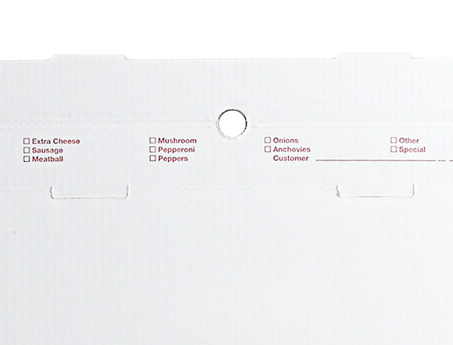 Once your guests have finished eating, this convenient printed box is recyclable for fast clean up. Plus, it features a convenient ingredient check list on the side, enabling you to mark each pizza's toppings for fast order identification at your pizza parlor, Italian restaurant, or convenience store.