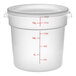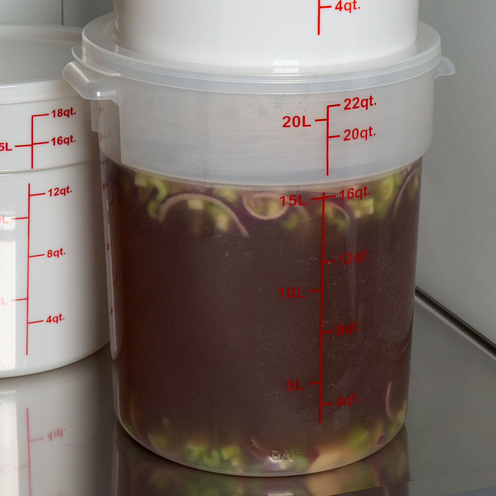 Whether storing dry goods or prepped ingredients, this container is versatile and can handle temperatures ranging from -40 to 160 degrees Fahrenheit, making it ideal for a wide range of kitchen tasks. This Choice translucent round polypropylene food storage container with lid is perfect for restaurants, catering establishments, delis, and cafes that want to enhance their service and streamline their prep organization!