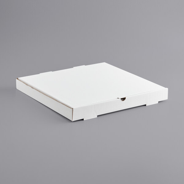 Made of 100% recycled, B-flute cardboard, this 18" x 18" high-quality white corrugated plain pizza box prevents grease and moisture from seeping through, making it perfect for packaging freshly-made pizzas, calzones, and strombolis. It ships flat to maximize storage space and can easily be assembled by folding along perforated edges and locking the ends into place.