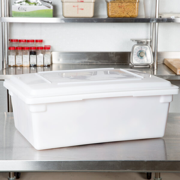 With built-in capacity indicators, this food storage box provides a way to accurately portion your prepped foods. It also features a labeling window on all four sides, allowing you to add dates and other important information for easy inventory checks and item rotations. Use it to transport supplies and store bulk foods. It's sure to be a versatile and convenient addition to any restaurant, hotel, deli, bakery, or catering kitchen.