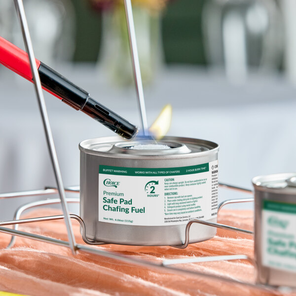 This premium chafing dish fuel is made with diethylene glycol, a substance that won't combust without a wick. This not only adds further protection for your staff and guests, but guards your establishment from dangerous fires that could cause irreparable damage. Plus, each canister stays cool to the touch when lit so you can ensure the safety of your staff while they work.