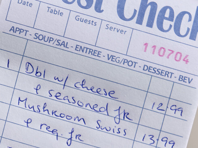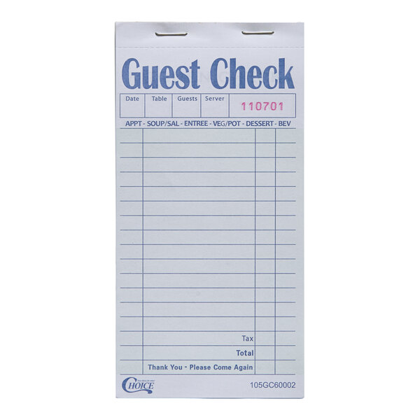 Featuring a 2 part design, this guest check ensures accurate record-keeping with one original and one copy of each check. Part 1 includes the original check, while part 2 consists of a white copy for your kitchen staff. Use the copies for added organization in both the front and back of the house.