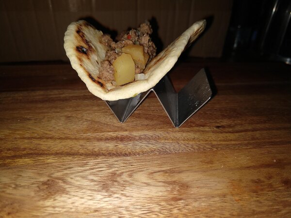 "Perfectly holds 1 or 2 tacos. Made of very thick stainless steel that won't bend and the shape of them allows for easy stacking to store them away."