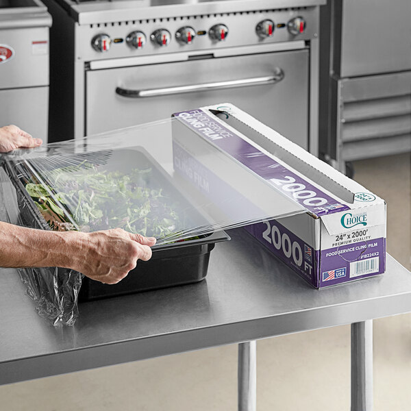 Easily cover, wrap, and seal in your food's freshness with this Choice 24" x 2000' foodservice film with serrated cutter!