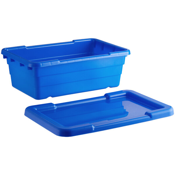 This Choice 25" x 15" x 8" blue meat lug / tote box with cover can be used for a variety of applications such as refrigerating whole meats in your busy deli shop or grocery store, or for storing processed beef, pork, or chicken in your large industrial freezer. It can even be used to hold dry ingredients or transport dinnerware and serving utensils.