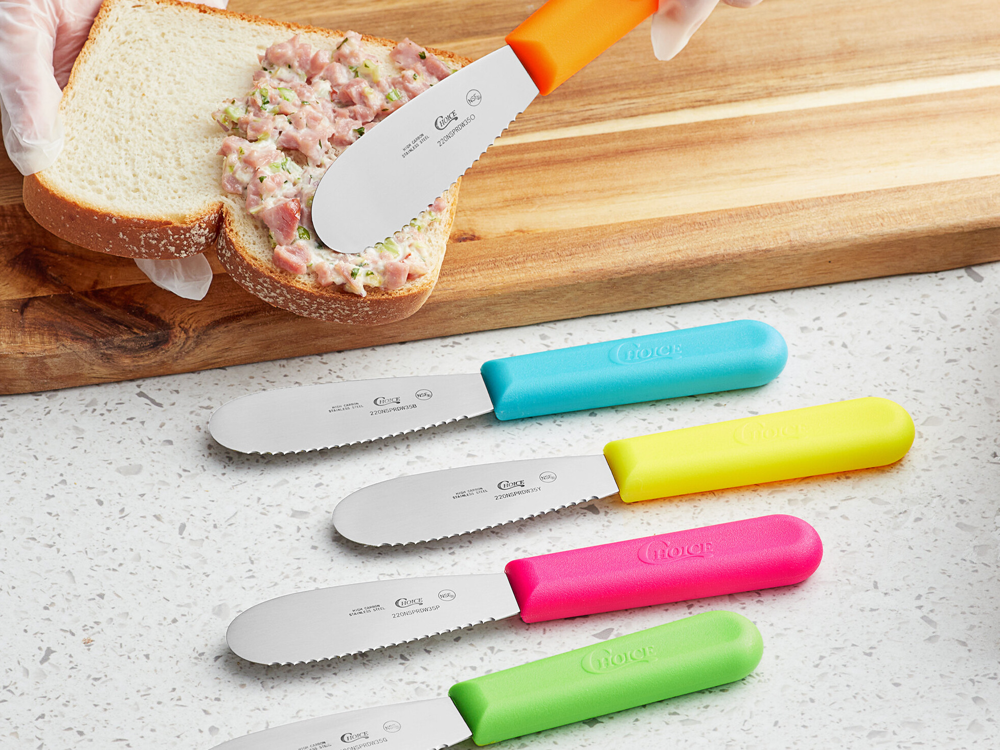 You can’t go wrong with this scalloped stainless steel sandwich spreader. It has a plastic handle that feels good in hand, it’s easy to use, and store. It easily cuts a toasted bagel, and then spreads the cream cheese. It fits just right in an individual serving size container of cream cheese.