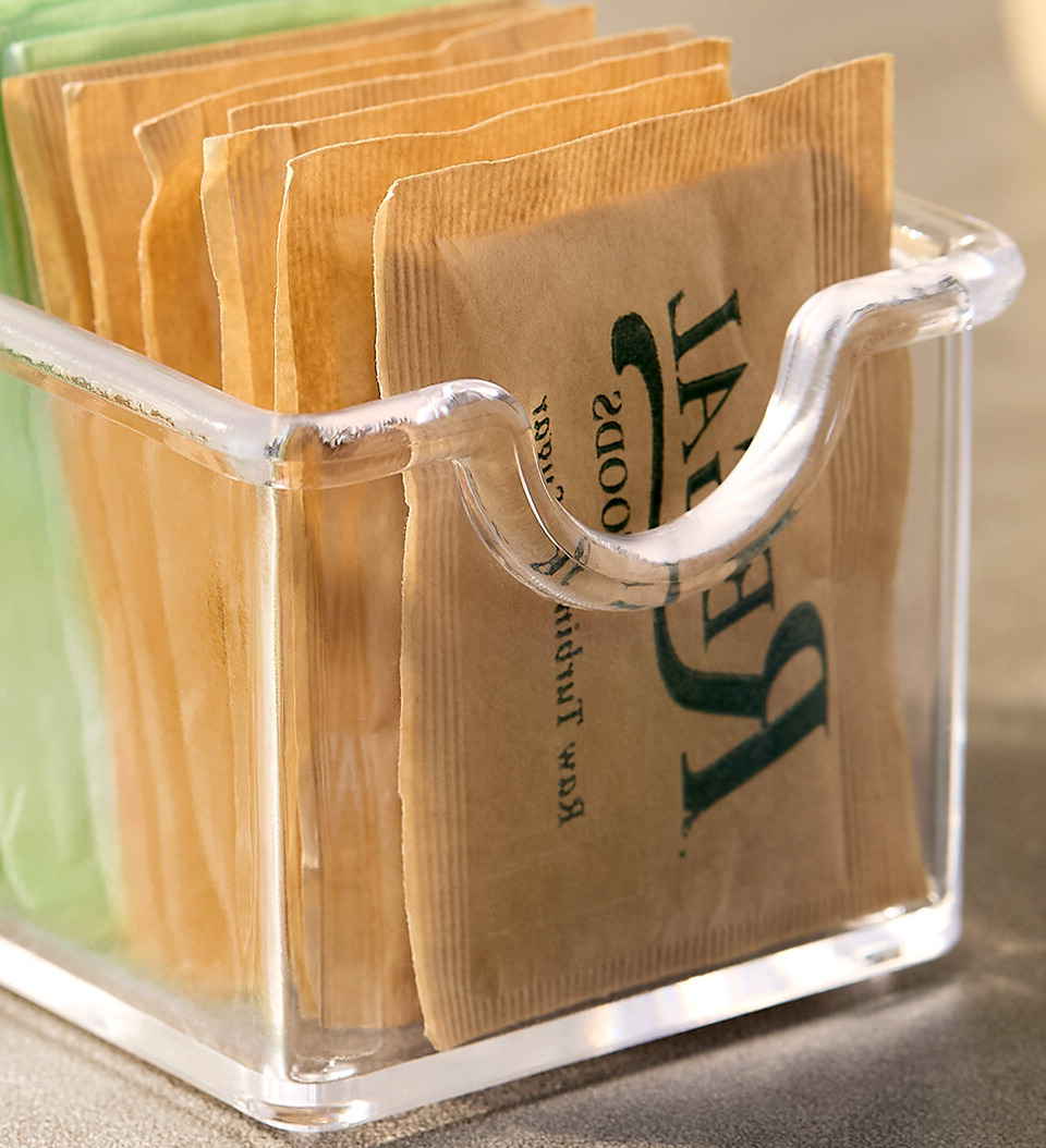 Perfect for diners, restaurants, and hotel breakfast displays, this caddy is designed to store sugar packets and tea bags. With a rectangular shape and a compact design, this caddy makes a convenient addition to any crowded tabletop. To optimize the dining experience, your customers will be able to select their favorite sweeteners without straying from the table. The side cutouts and rounded edges allow for quick and easy selection! Simple to place and transport, you can also use the caddy to organize coffee bars and hotel amenity trays.
