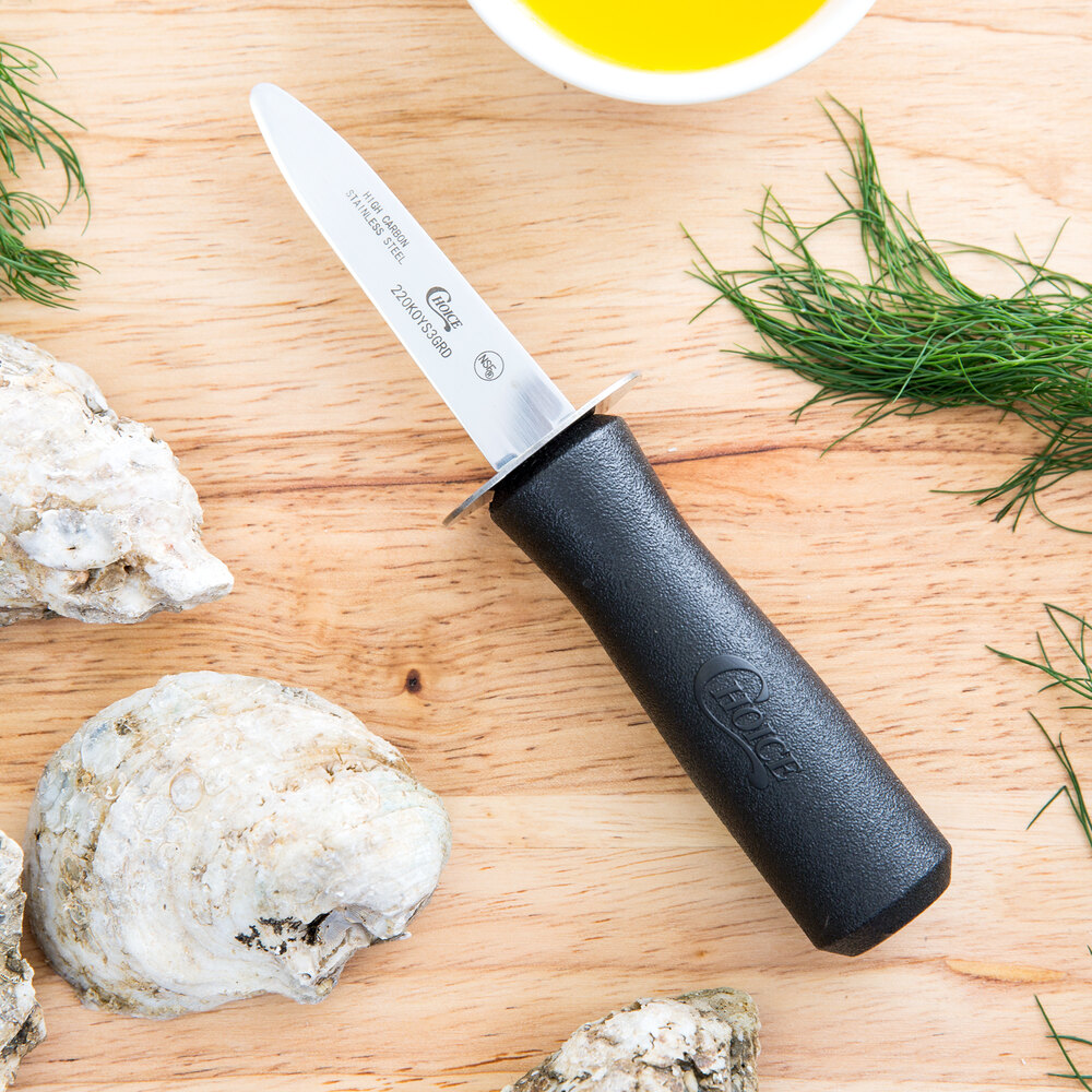 Opening shellfish can be tedious, but this Choice 3" Boston style oyster knife with guard and black handle is designed to make the process easier. Regardless of your technique or familiarity with oyster shucking, this knife is the perfect tool for beginners and experts alike.