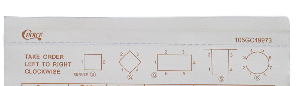 Table diagrams at the top of each sheet enhance order accuracy and are versatile to fit the needs of any venue. Each patron is assigned a placement at the table that corresponds with a row on the order pad. This allows food runners to serve orders while the original waiter or waitress takes care of other tables.