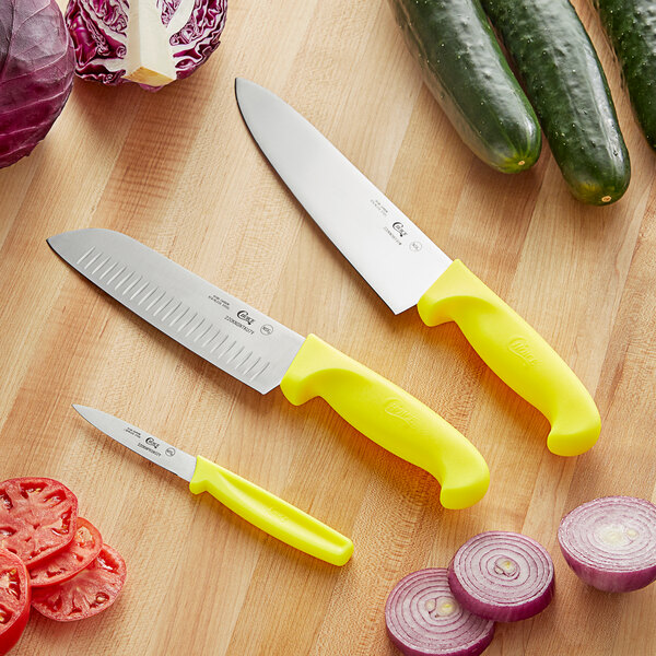 I LOVE the color of these knives - super bright turquoise blue!! The handles are a lightweight plastic, but the knives felt balanced and well-made like they would stand up to many years of use and sharpening.