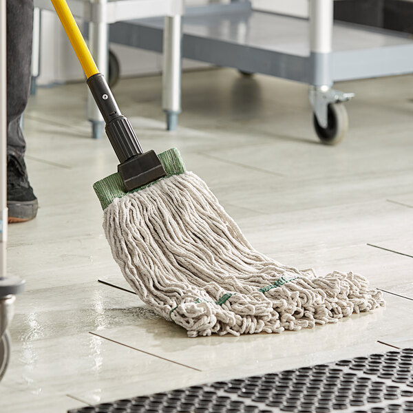Good, cheap mop head that we use at our coffee shop. They do a decent job cleaning the floors and the actual head cleans up great in a laundry machine with some bleach. The middle band makes securing to a handle easy and quick!