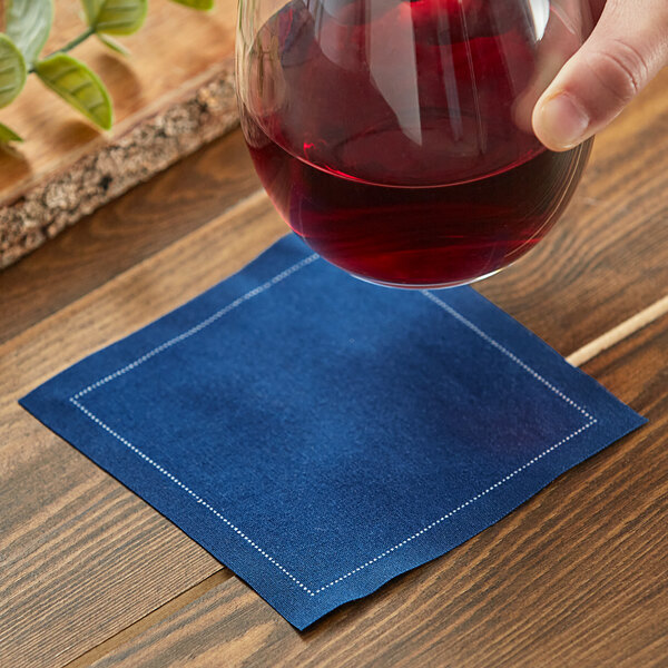 Featuring a simple, classic navy design, this napkin easily matches a variety of decor and can be folded creatively to enhance your table presentations. Plus, its soft construction makes it perfect for placing beneath drinks or for cleaning up spills at your busy bar or restaurant.