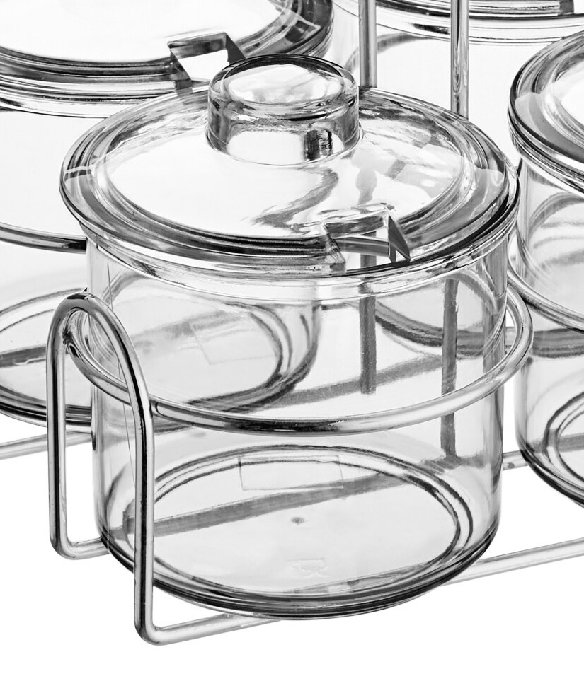 This condiment caddy with jars is perfect for restaurants, buffets, carnival stands, or banquet halls. It's at home on either a condiment table at a burger stand to allow customers the chance to spice up their own fries or on the table at an upscale restaurant serving gourmet salads and dressings. Use this caddy with plastic jars to create a candy bar at your catered event, display ingredients at your buffet, or store condiments at outdoor venues!
